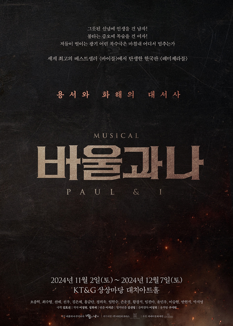 뮤지컬 '바울과 나'는 2024년 11월 2일부터 12월 7일까지 서울 KT&G 상상마당 대치아트홀에서 공연됩니다.