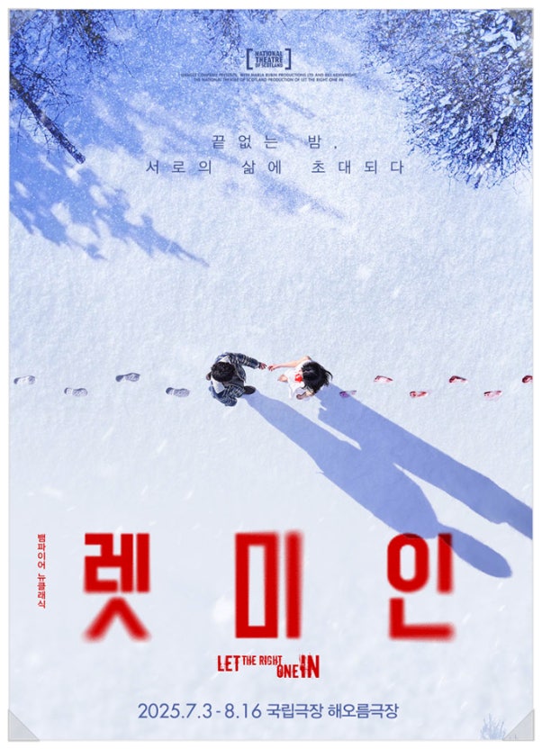 2025년 7월 3일부터 8월 16일까지 서울 국립극장 해오름극장에서 공연 중인 **연극〈렛미인〉**은 스웨덴 작가 욘 아이비데 린드크비스트(Yon A. Lindqvist)의 동명 소설을 바탕으로 한 작품으로, 2013년 스코틀랜드 국립극단에서 처음 연극으로 만들어졌고, 한국에서는 2016년 초연, 2025년 재연되는 작품입니다.